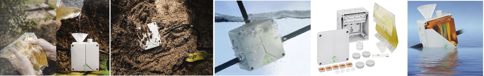 Spojovacia krabica IP68, vodotestná, zaliatie živicou, pre vonkajšie použitie v záplavových oblastiach, taktiež použitie na uloženie do zeminy, tunely, prístavy, umývacie zariadenia a pod.